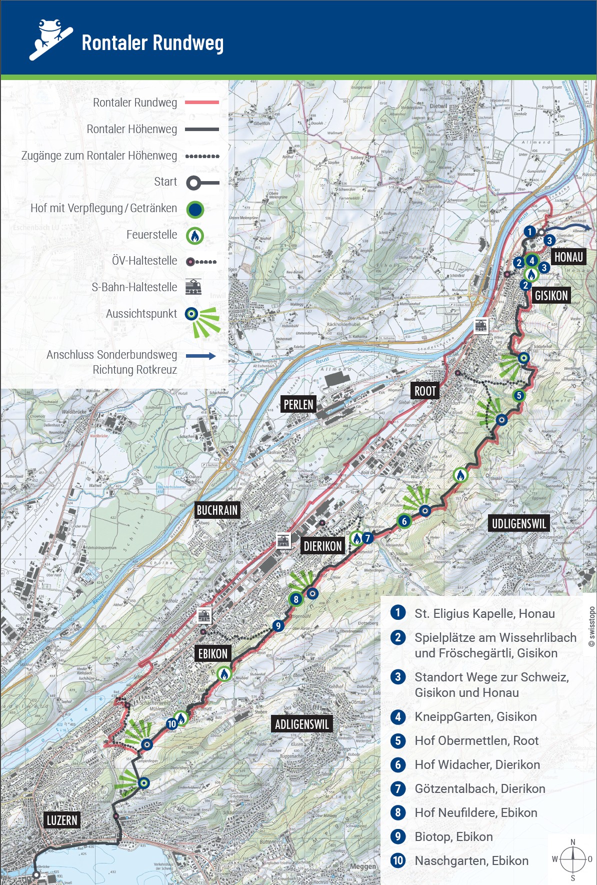 Das Projekt ist aus einer Weiterentwicklung des bisherigen Höhenwegs hervorgegangen und schafft erstmals eine durchgängige Rundtour, die das gesamte Rontal umrundet. Der Rundweg kombiniert diese neue Flussschlaufe mit dem bestehenden Höhenweg, der sich über die Hänge des Rontals zieht und durch Orte wie Gisikon, Root, Dierikon, Ebikon und Honau führt. Die Höhenroute bietet weite Ausblicke über das Tal, führt durch Wälder und über aussichtsreiche Hügelzüge und ist bei Wanderfreunden seit Jahren beliebt.